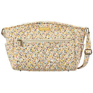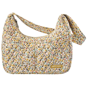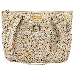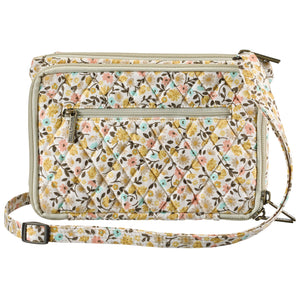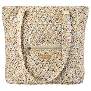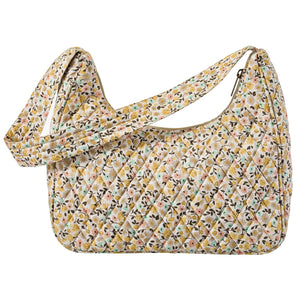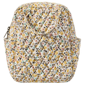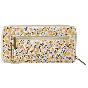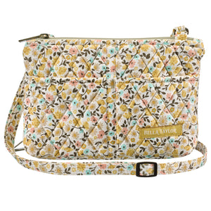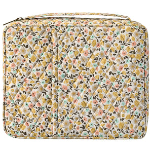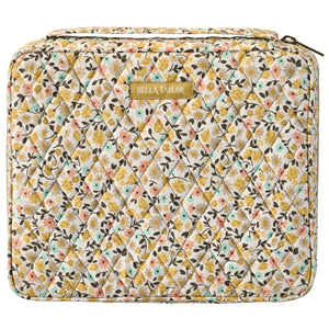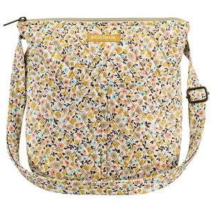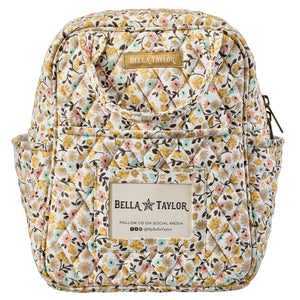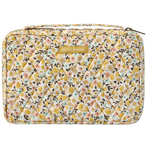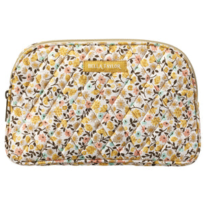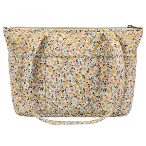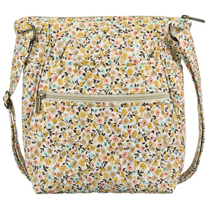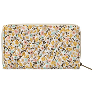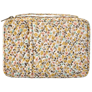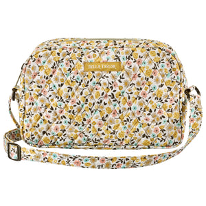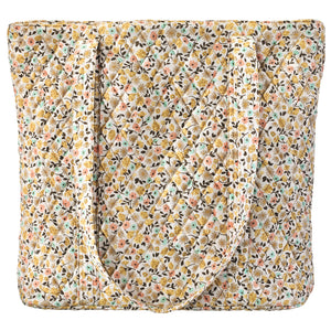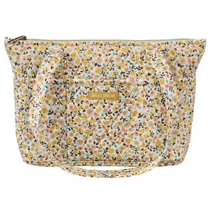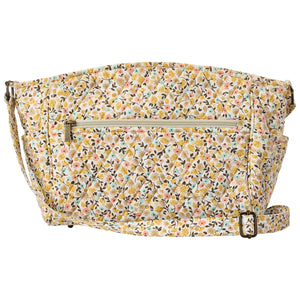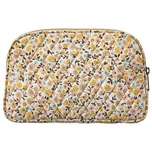 Soft, vintage-inspired blooms in harvest amber, dusty rose, warm tan, and robin’s egg blue are scattered across a warm cream backdrop. A 100% cotton fabric, reminiscent of a quiet walk through spring fields.